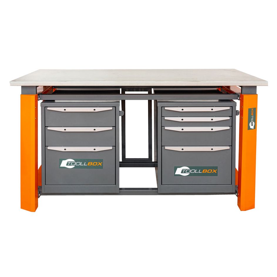 Верстак ТВР1800 (ТВ3-ТВ4) — это вместительное и добротно организованное рабочее место для мастерской, производственного участка или сервисной зоны, где важны не только прочность, но и удобное хранение инструмента под рукой. Модель выполнена в двухтумбовой комбинированной конфигурации: с одной стороны установлена тумба с тремя выдвижными ящиками, с другой — тумба с четырьмя ящиками. Такое решение помогает логично распределить оснастку, крепеж, ручной инструмент и расходные материалы по назначению, не загромождая рабочую поверхность.